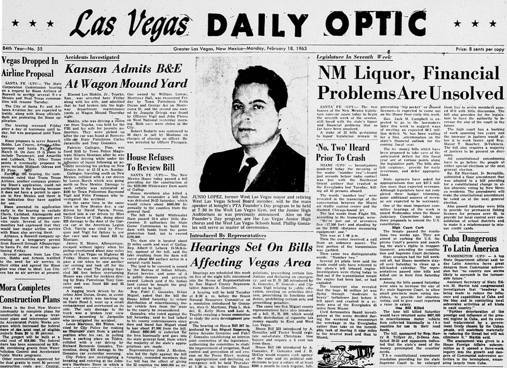 Front page of the Feb. 18, 1963 issue of the Las Vegas Optic. Front page of the Feb. 18, 1963 issue of the Las Vegas Optic. St. Michael’s College will provide the opposition for the Highlands Cowboys tonight when the two quints square off at 8 o’clock in Stu Clark