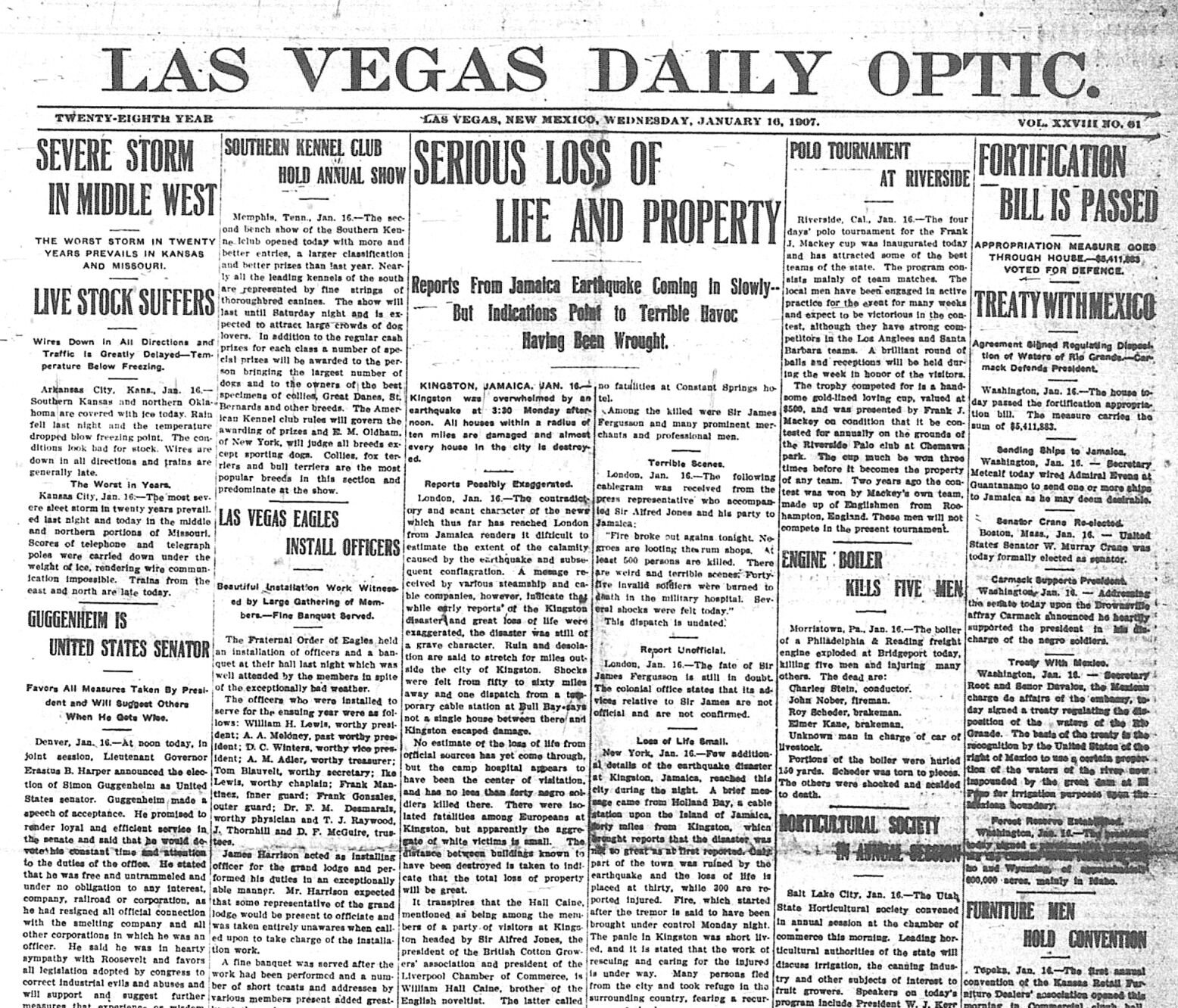 Front page of the Dec. 26, 1957 issue of the Las Vegas Optic. Front page of the Dec. 26, 1957 issue of the Las Vegas Optic. C.R. Williams is here from Albany, N.Y. W.J. Brown, of St. Ignace, Mich., stops at the Montezuma. The boiler house stands finished and is