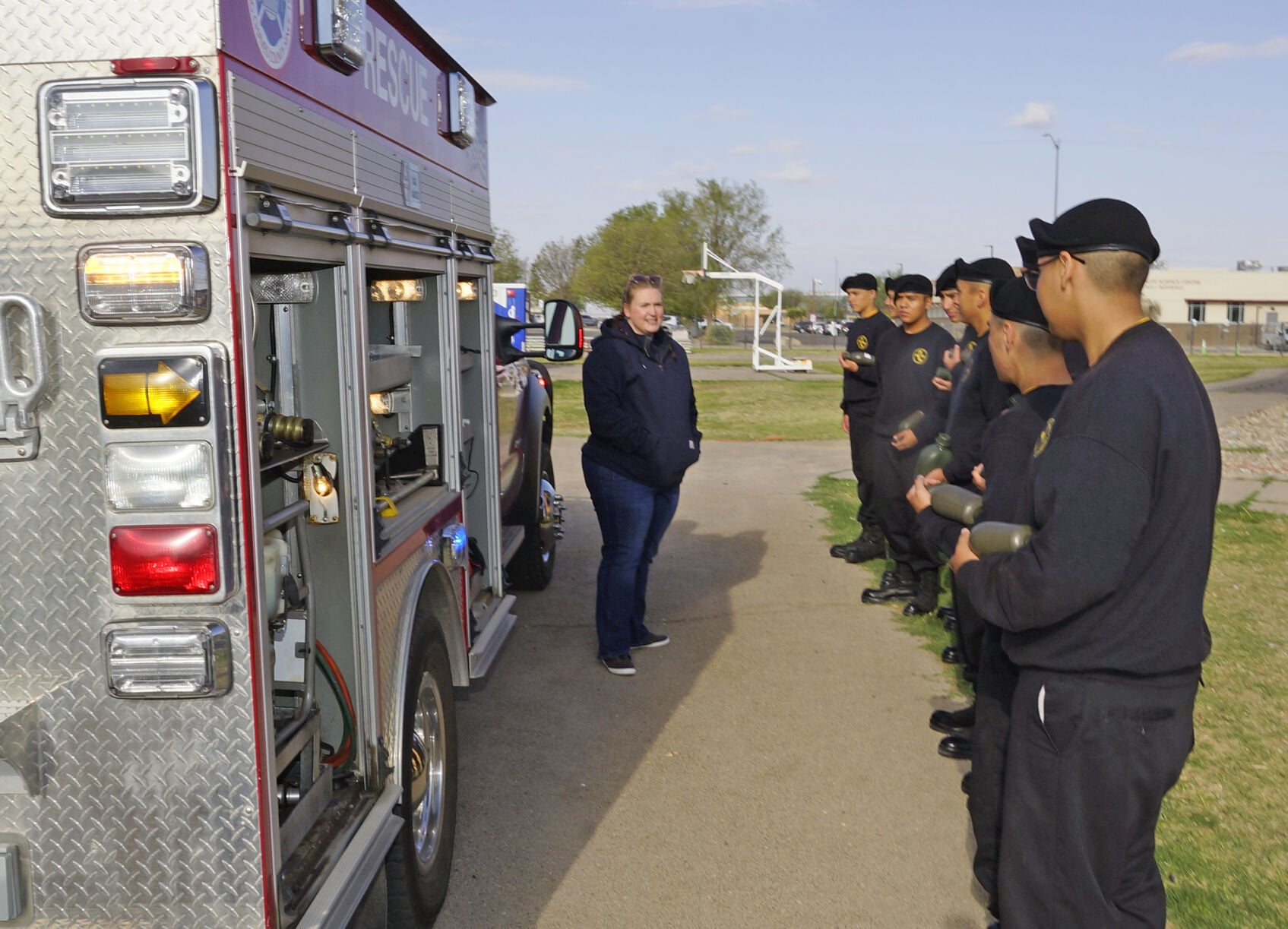 Charlotte Taylor, left, who is with the Berrendo Volunteer Fire Department, explains some of the equipment used by first responders to cadets …