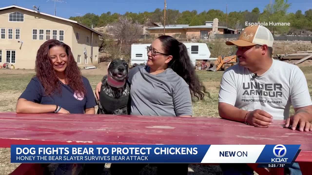 ESPAÑOLA, N.M. —Honey, a 12-year-old mixed-breed dog owned by the Martinez family, is being praised for her bravery after surviving a bear attack while protecting the family's chickens.The family said they woke up in early March to find Honey barely breathing and badly injured in their driveway. At first, they