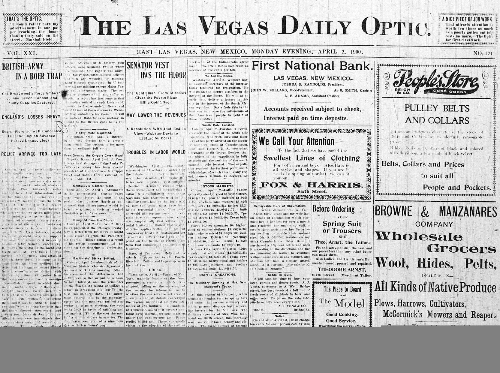 Front page of the Mach 16, 1939 issue of the Las Vegas Optic. Front page of the Mach 16, 1939 issue of the Las Vegas Optic. From Davenport (Iowa) Gazette Las Vegas is the natural gateway to the vast Territory of New Mexico. It is to this territory what Denver